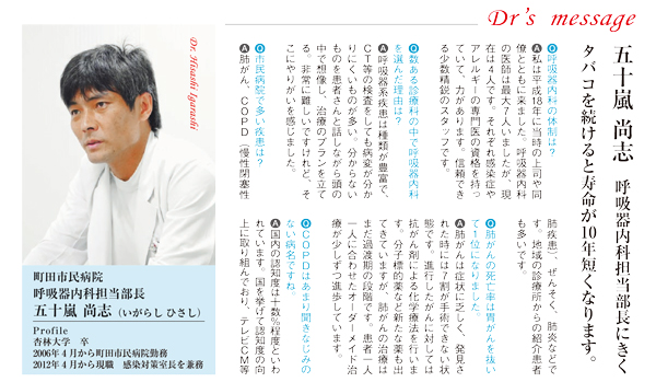 いままで、町田市民病院呼吸器内科部長として、町田市民の皆様の健康増進に努めてまいりましたが、これからは、一医師としての立場から貢献できればと思います。